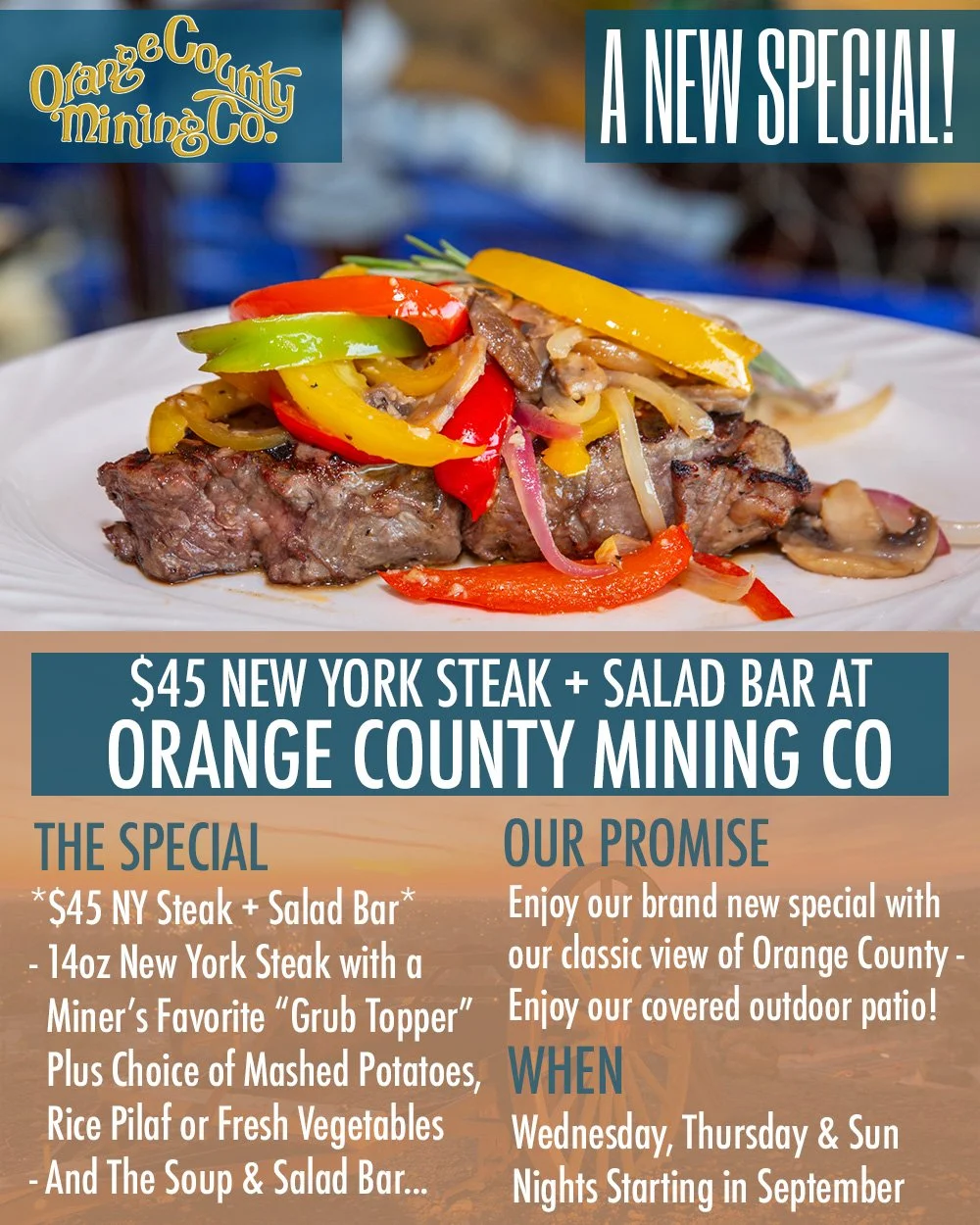 Come enjoy our brand new special: a 14oz New York steak with a Miner’s Favorite “Grub Topper” featuring peppers, mushrooms and onions - plus your choice of mashed potatoes, rice pilaf or fresh vegetables - and of course the soup & salad bar! Take in the beautiful late summer view overlooking Orange County from our dining room our incredible covered outdoor patio - all for an incredible total price!