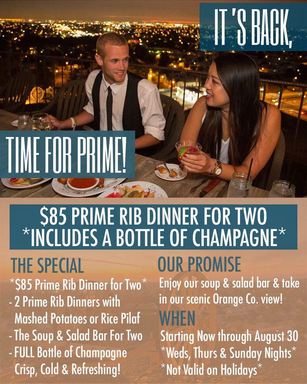 Come experience the return of our incredible dinner special: 2 prime rib dinners with mashed potatoes or rice pilaf. And of course, enjoy our soup & salad bar while taking in our breathtaking scenic Orange County view. Incredible flavor, incredible value — available only on Wednesday, Thursday & Sunday evenings at Orange County Mining Co.